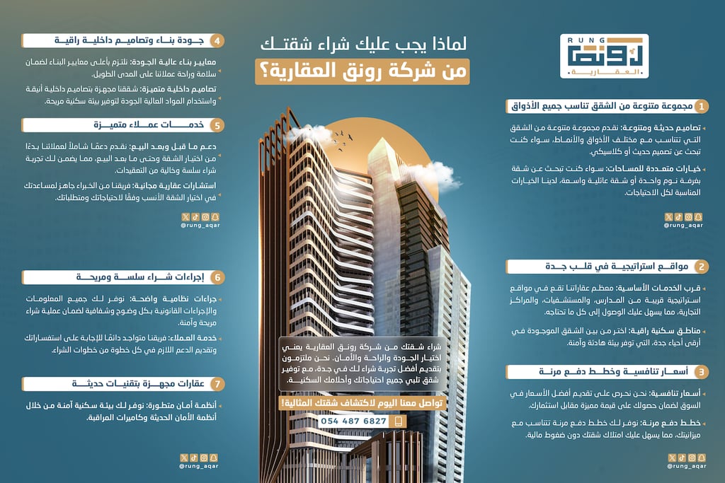 إن شراء شقتك من شركة رونق العقارية يعني اختيار الجودة، والراحة، والموقع المميز، والخدمة الاحترافية في آنٍ واحد. إنها تجربة سكنية متكاملة تهدف إلى تلبية جميع احتياجاتك وتطلعاتك المستقبلية. فإذا كنت تبحث عن شقة تجمع بين الأناقة والقيمة والاستقرار، فقد حان الوقت لاتخاذ الخطوة الأولى نحو منزل أحلامك.